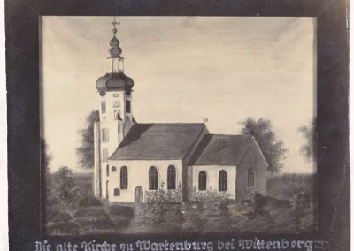 Ein Bild zeigt die alte, 1875 abgerissene Wartenburger Kirche mit dem Hinweis, das Original befindet sich im Besitz einer Frau Schmidt in Göritzhain.