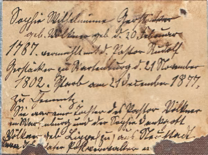 „Sophie Wilhelmine Gerstäcker, geb. Völkner, geb. d. 20. Februar 1787, vermählt mit d. Pastor Rudolf Gerstäcker zu Wartenburg d. 21. November 1802. Starb am 21. Dezember 1877 zu Chemnitz.
