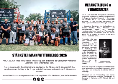 Auch 2026 soll in Wartenburg viel bewegt und schwere Aufgaben bewältigt werden. Doch ist hier nicht vom sich anbahnenden Neubau des Elbdamms die Rede. Vielmehr heißt es zum dritten Mal in Folge wer ist der „Stärkste Mann Wittenbergs“.