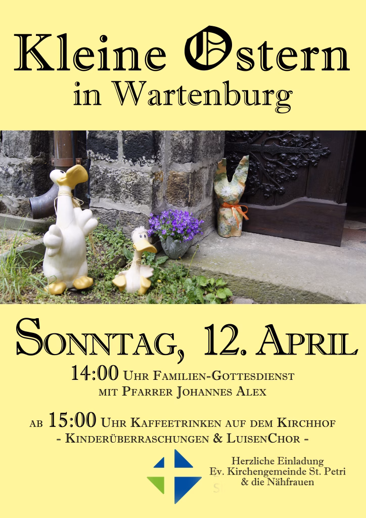 « Alle Veranstaltungen Kleine Ostern auf dem Kirchhof 12. April, 2026 - 14:00 - 18:00 « Osterfeuer 150 Jahre neue Kirche in Wartenburg » Zum Kalender hinzufügen Google Kalender iCalendar Outlook 365 Outlook Live Details Datum: 12. April, 2026 Zeit: 14:00 - 18:00 Veranstaltungsort Kirche Wartenburg