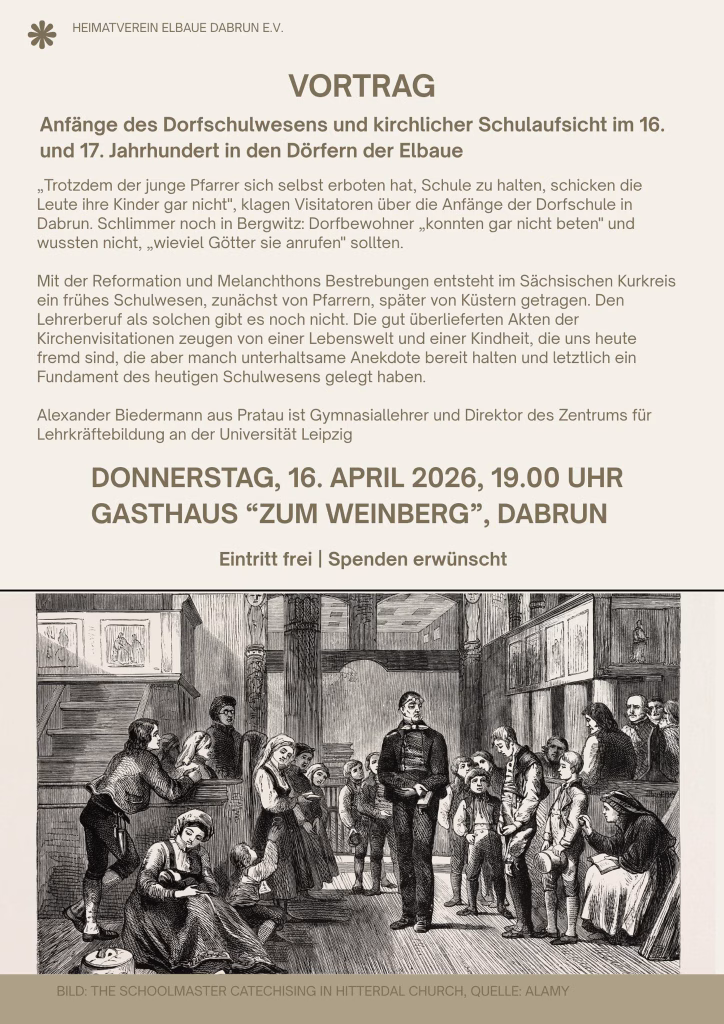 « Alle Veranstaltungen Vortrag in Dabrun „Die Anfänge des Dorfschulwesens in der Elbaue“ 16. April, 2026 - 19:00 - 21:00 « Kleine Ostern auf dem Kirchhof 150 Jahre neue Kirche in Wartenburg » Zum Kalender hinzufügen Google Kalender iCalendar Outlook 365 Outlook Live Details Datum: 16. April, 2026 Zeit: 19:00 - 21:00
